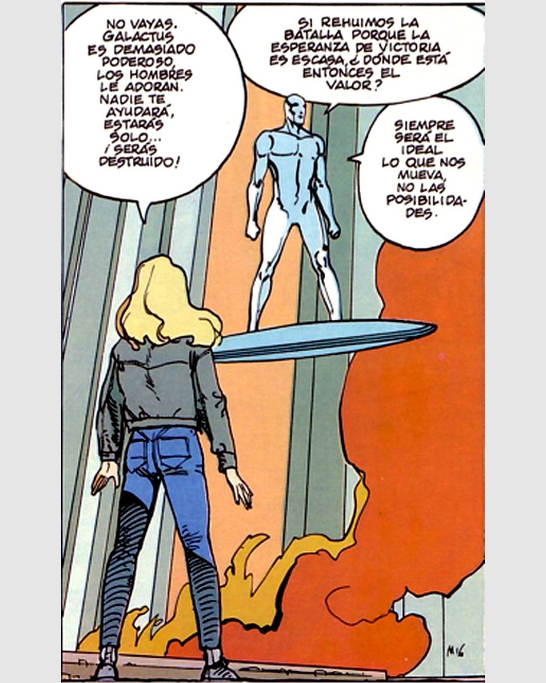 Pienso en la viñeta de Silver Surfer dibujada por Moebius sobre texto de Stan Lee: una figura erguida frente al incendio, pequeña ante la magnitud del desastre, pero vertical. Esa imagen resume una verdad antigua y urgente: uno se pone de pie no porque las probabilidades favorezcan el cambio, sino porque la dignidad exige dejar constancia de la oposición. Resistir es, muchas veces, negarse a que la historia quede escrita solo por quienes aprietan el gatillo.